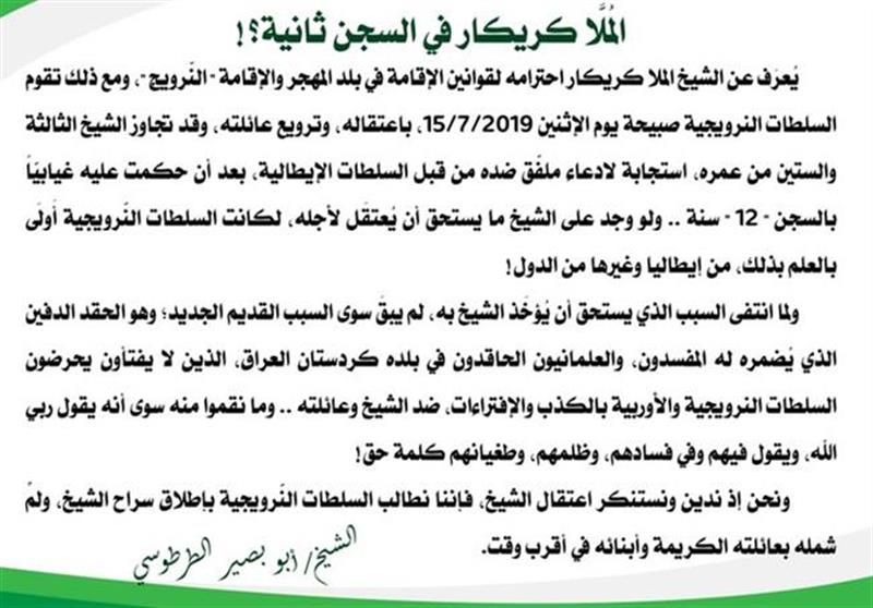 يُعرَف عن الشيخ الملا كريكار احترامه لقوانين الإقامة في بلد المهجر والإقامة " النّرويج "، ومع ذلك تقوم السلطات النرويجية صبيحة يوم الإثنين 15/7/2019، باعتقاله، وترويع عائلته، وقد تجاوز الشيخ الثالثة والستين من عمره، استجابة لادعاء ملفّق ضده من قبل السلطات الإيطالية، بعد أن حكمت عليه غيابيّاً بالسجن " 12 " سنة .. ولو وجد على الشيخ ما يستحق أن يُعتقَل لأجله، لكانت السلطات النّرويجية أَولَى بالعلم بذلك، من إيطاليا وغيرها من الدول!
